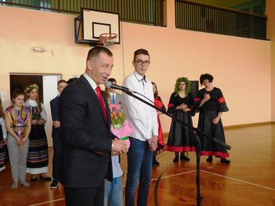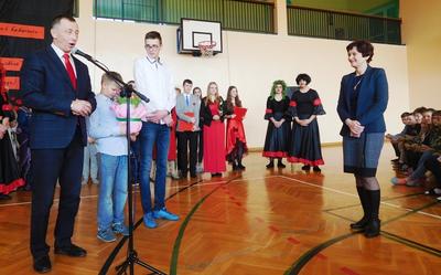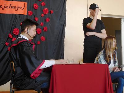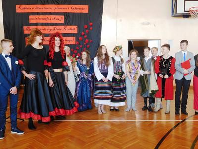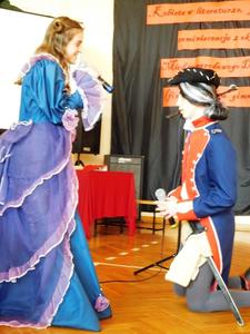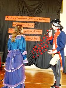 8. marca w naszej sali gimnastycznej odbył się nietypowy finał jednego z projektów gimnazjalnych. Do projektu przystąpili uczniowie z klasy III a: Aleksandra Górka, Sandra Warzyńska, Kacper Klocek, Bartłomiej Nowak. Wspomagali ich koledzy z tej samej klasy: Robert Mirzojanc i Karol Nowocień oraz liczna grupa młodzieży z kl. VII a szkoły podstawowej, która przedstawiała fragment „Zemsty” A. Fredry i „Balladyny” J. Słowackiego. W rolę Papkina z „Zemsty” wcielił się Mikołaj Kornafel, a Klary Róża Krzesińska. Doskonale zagrała Matkę z „Balladyny” Julia Gryz, Alinę – Karolina Bączkowska, Balladynę – Aleksandra Gierasińska, Kirkora- Damian Pysiak , Skierkę intryganta- Wiktoria Stus, a sługę Hubert Płatos.