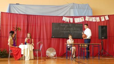Po przemówieniach zaproszonych gości (m.in. p. wójta gminy Jedlińsk – Kamila Dziewierza, p. Róży Domańskiej – właścicielki Księgarni Literackiej im. W. Gombrowicza w Radomiu czy przedstawicieli Rady Rodziców Zespołu Szkolno – Przedszkolnego we Wsoli) uczniowie klasy III a PG zaprezentowali krótki program artystyczny odwołujący się do atmosfery związanej z ukończeniem szkoły przez gimnazjalistów oraz do biografii patrona szkoły – Witolda Gombrowicza. W roli Witolda Gombrowicza doskonale zaprezentował się Kacper Klocek. Towarzyszyli mu: Sandra Warzyńska i Karol Nowocień, którzy wcielili się w role absolwentów naszej szkoły. Scenki rodzajowe epatowały humorem i wzbogacone zostały pokazem tanecznym uczniów klas: III PSP oraz śpiewem solistek: Aleksandry Adamczyk, Andżeliki Bartosiak, Julii Gryz oraz Karoliny Płowiec. Tancerzy, którzy zebrali rzęsiste brawa przygotowały panie: A. Motyka, J. Piasek i L. Parendyk.