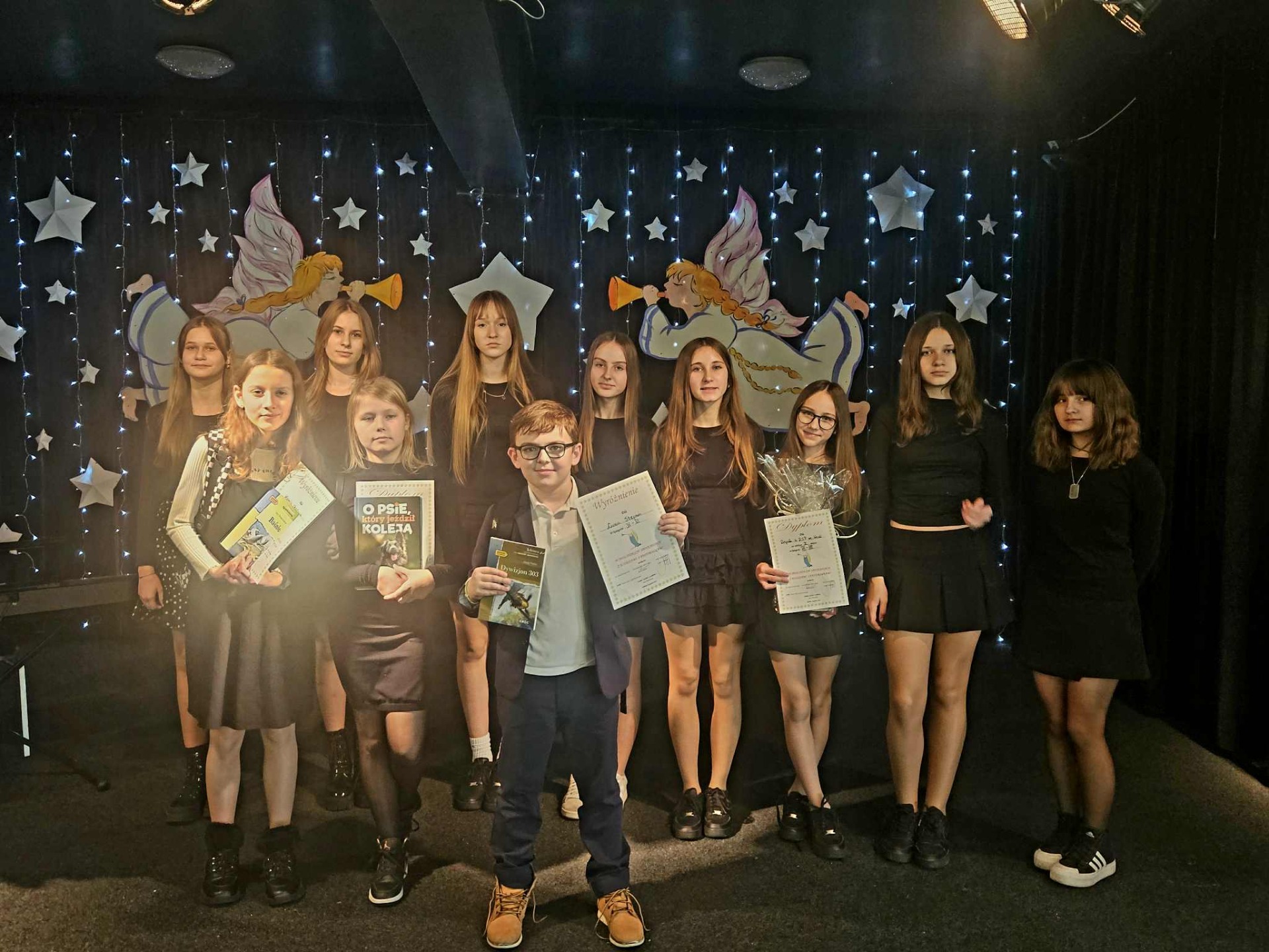 Nasi uczniowie zaprezentowali wysoki poziom artystyczny, wykazując się nie tylko talentem wokalnym, ale również odwagą sceniczną. Najmłodszą uczestniczką z naszej szkoły była Kornelia Krajewska z klasy 2a, która odważnie zaśpiewała przed wymagającą publicznością. Z dumą informujemy także, że Zuzanna Karaś z klasy 4b kolędą Wśród nocnej ciszy wyśpiewała sobie II miejsce indywidualne, zaś uczennice z klas siódmych: Zuzanna Grzybowska, Julia-Ida Łukawska, Oliwia Marzec, Julia Płatos, Marta Różańska, Lena Rudecka, Aleksandra Szymańska oaz Oliwia Ślifirczyk wykonały Pastorałkę od serca do ucha i w kategorii zespoły także zajęły II miejsce. Na wyróżnienie jurorów zasłużyli Kamila Chodowicz i Leon Stępień z klasy 4b. Za przygotowanie i opiekę na konkursie odpowiedzialni byli p. Katarzyna Sadowska i ks. Marcin Dębowski.