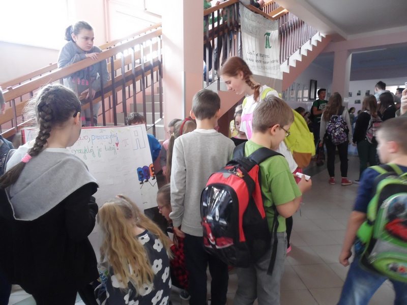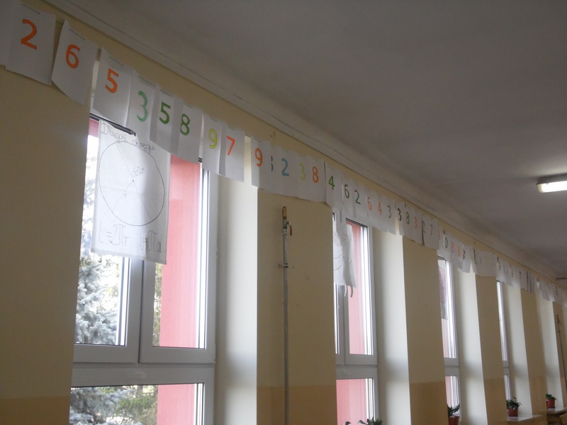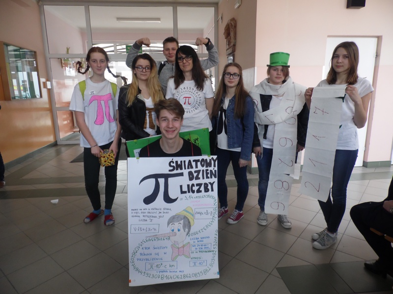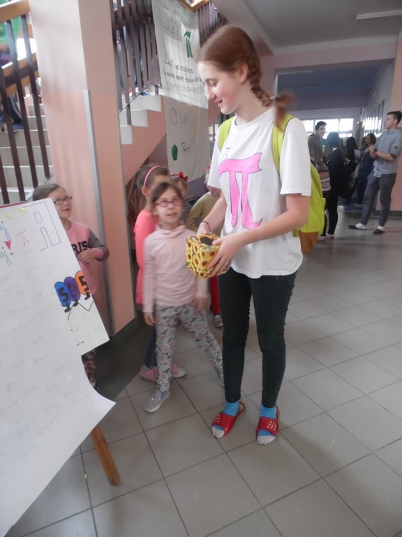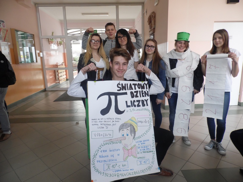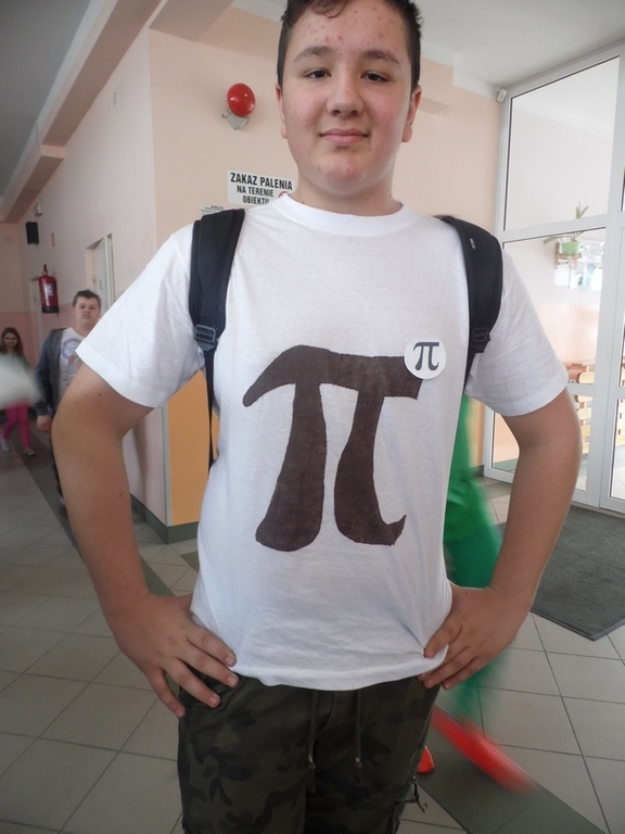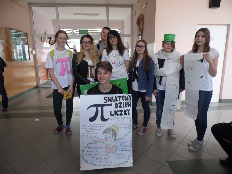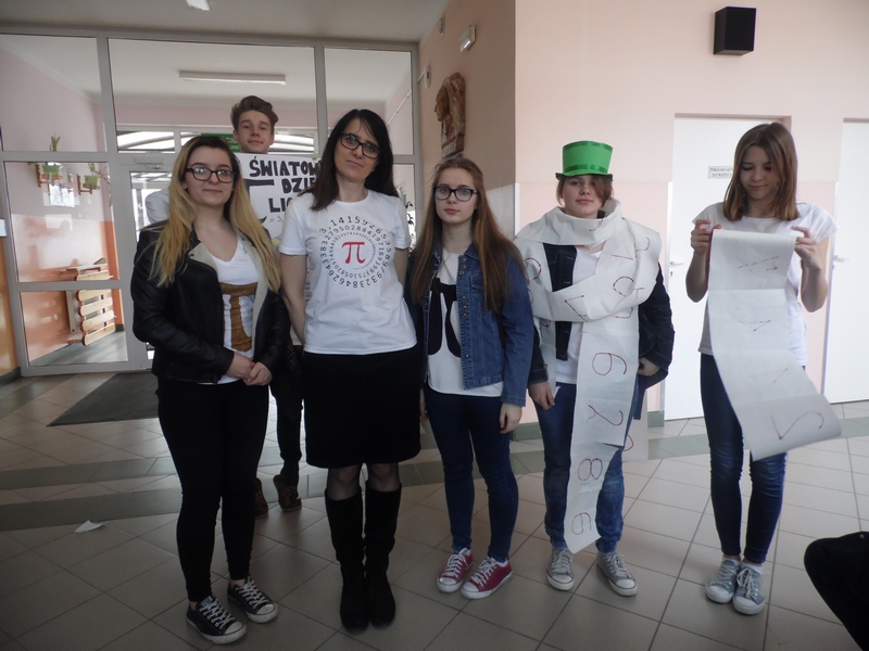 Zarówno goście, jak i społeczność szkolna mogli przypomnieć sobie wiedzę matematyczną z lat szkolnych. 17 marca 2017 roku działo się dużo więcej… Na parterze witała wchodzących klasa IIa, która rozdawała kotyliony z liczbą ,,Pi”. Zuzanna Nowak przebrana za Pipi Langstrum fonetycznym brzmieniem imienia bohaterki literackiej nawiązywała do brzmienia liczby ,,Pi”. Uczniowie rozdawali ulotki z wierszykiem o tej liczbie. Klasa IIa oraz niektórzy uczniowie innych klas nosili koszulki własnoręcznie zrobione promujące tę liczbę. Główną odpowiedzialną za organizację Dnia Liczby ,,¶” była Anna Borkowska-Szymaniak przy współpracy z pozostałymi nauczycielkami matematyki naszej szkoły.
