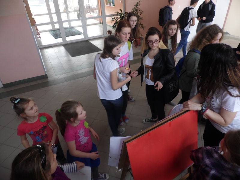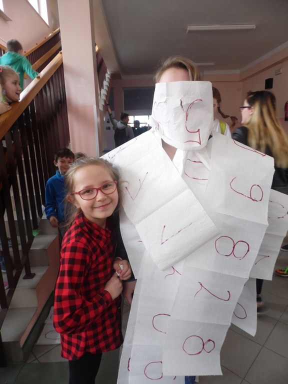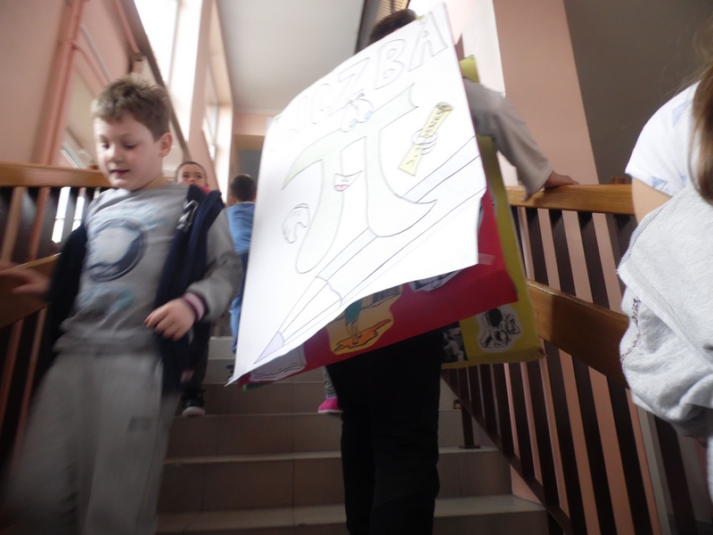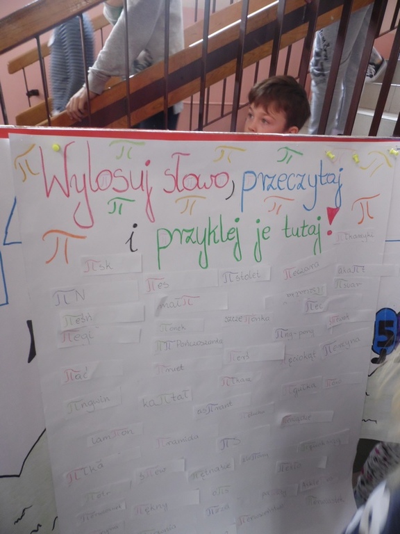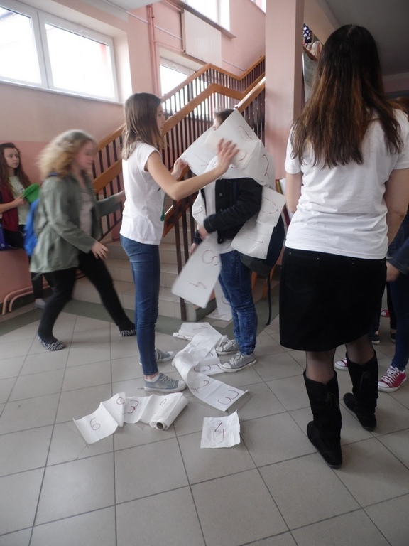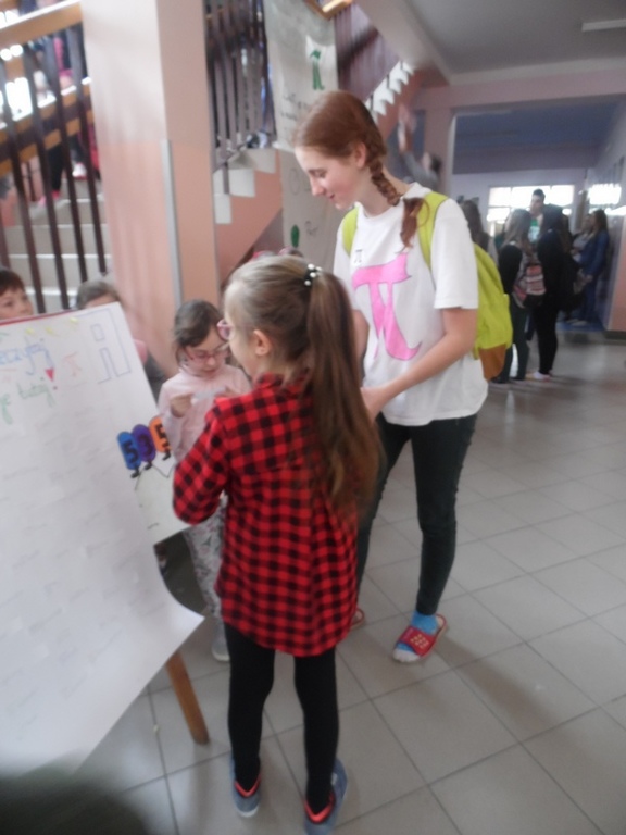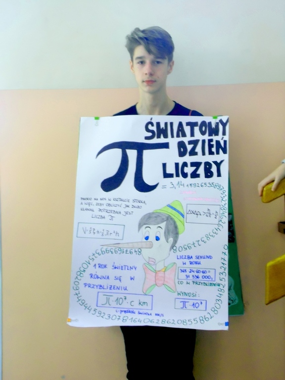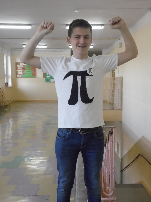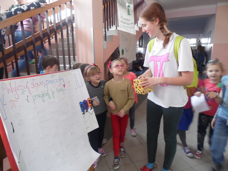 Zarówno goście, jak i społeczność szkolna mogli przypomnieć sobie wiedzę matematyczną z lat szkolnych. 17 marca 2017 roku działo się dużo więcej… Na parterze witała wchodzących klasa IIa, która rozdawała kotyliony z liczbą ,,Pi”. Zuzanna Nowak przebrana za Pipi Langstrum fonetycznym brzmieniem imienia bohaterki literackiej nawiązywała do brzmienia liczby ,,Pi”. Uczniowie rozdawali ulotki z wierszykiem o tej liczbie. Klasa IIa oraz niektórzy uczniowie innych klas nosili koszulki własnoręcznie zrobione promujące tę liczbę. Główną odpowiedzialną za organizację Dnia Liczby ,,¶” była Anna Borkowska-Szymaniak przy współpracy z pozostałymi nauczycielkami matematyki naszej szkoły.