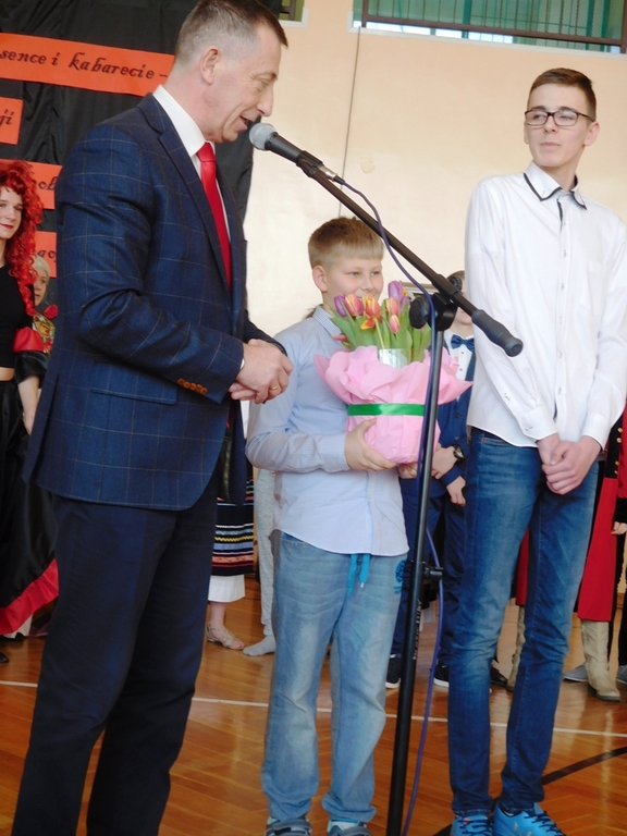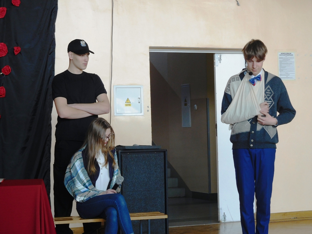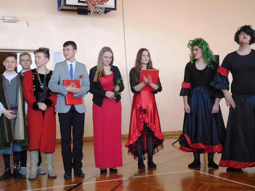 8. marca w naszej sali gimnastycznej odbył się nietypowy finał jednego z projektów gimnazjalnych. Do projektu przystąpili uczniowie z klasy III a: Aleksandra Górka, Sandra Warzyńska, Kacper Klocek, Bartłomiej Nowak. Wspomagali ich koledzy z tej samej klasy: Robert Mirzojanc i Karol Nowocień oraz liczna grupa młodzieży z kl. VII a szkoły podstawowej, która przedstawiała fragment „Zemsty” A. Fredry i „Balladyny” J. Słowackiego. W rolę Papkina z „Zemsty” wcielił się Mikołaj Kornafel, a Klary Róża Krzesińska. Doskonale zagrała Matkę z „Balladyny” Julia Gryz, Alinę – Karolina Bączkowska, Balladynę – Aleksandra Gierasińska, Kirkora- Damian Pysiak , Skierkę intryganta- Wiktoria Stus, a sługę Hubert Płatos.