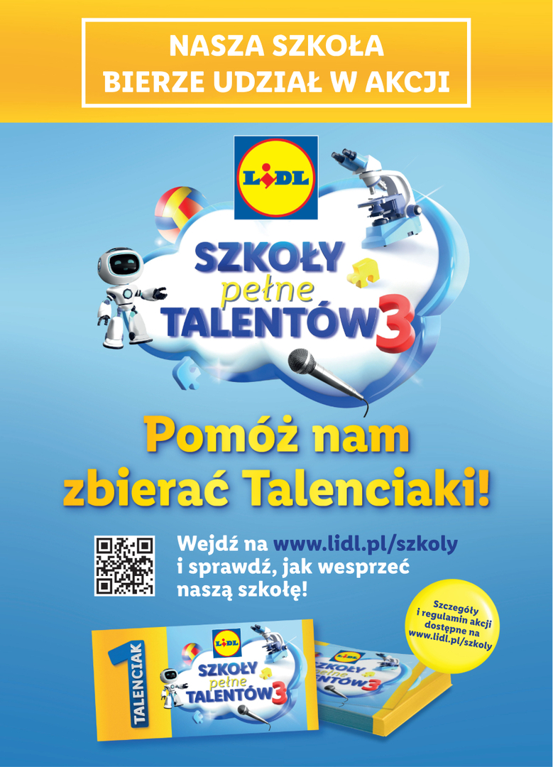 już po raz trzeci nasza szkoła bierze udział w projekcie "Szkoły Pełne Talentów" organizowanym przez sieć sklepów LIDL. Z Waszą pomocą chcemy rozwijać dziecięce talenty, a możecie to robić nawet podczas tak prozaicznych zajęć jak codzienne zakupy.