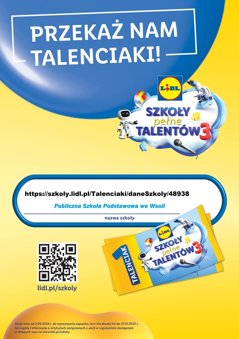 Za zebrane Talenciaki nasza szkoła otrzyma sprzęt edukacyjny i sportowy.