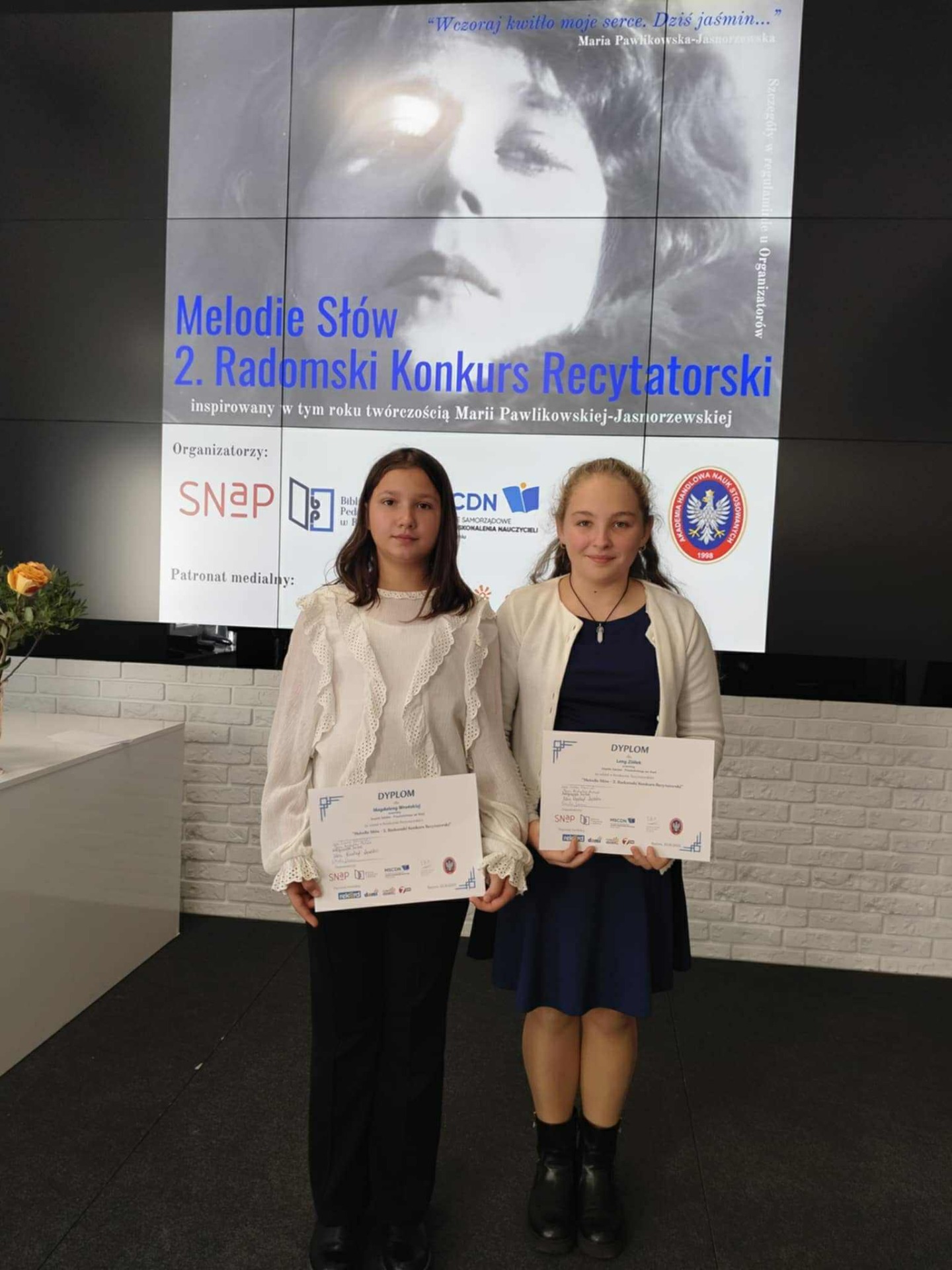Dnia 23.10.2025 roku uczennice z klasy 5b: Magdalena Wrońska i Lena Ziółek oraz z klasy 8b: Julia Alberska i Małgorzata Wojciechowska wystąpiły w Konkursie Recytatorskim „Melodie Słów” organizowanym przez Bibliotekę Pedagogiczną w Radomiu.