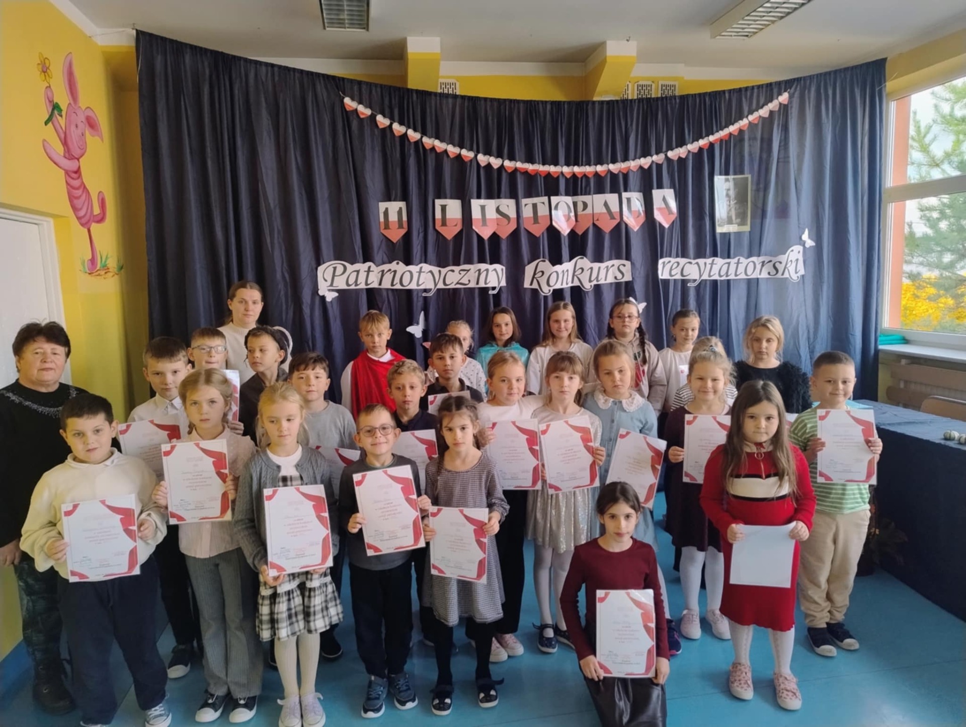 W dniu 29 października w naszej szkole odbyły się eliminacje szkolnego konkursu patriotycznego dla uczniów klas 0-III. Spośród wielu chętnych recytatorów, którzy z zaangażowaniem prezentowali swoje umiejętności, jury w składzie: Dyrekcja szkoły oraz nauczyciele współorganizujący proces kształcenia wyłoniło sześciu laureatów: Wojciech Kwiecień (0b), Michał Sułkowski (1a), Iga Wrona (1b), Władysław Wikaliński (2a), Aleksander Łyżwa (2b), Lena Kwiecień (3c).