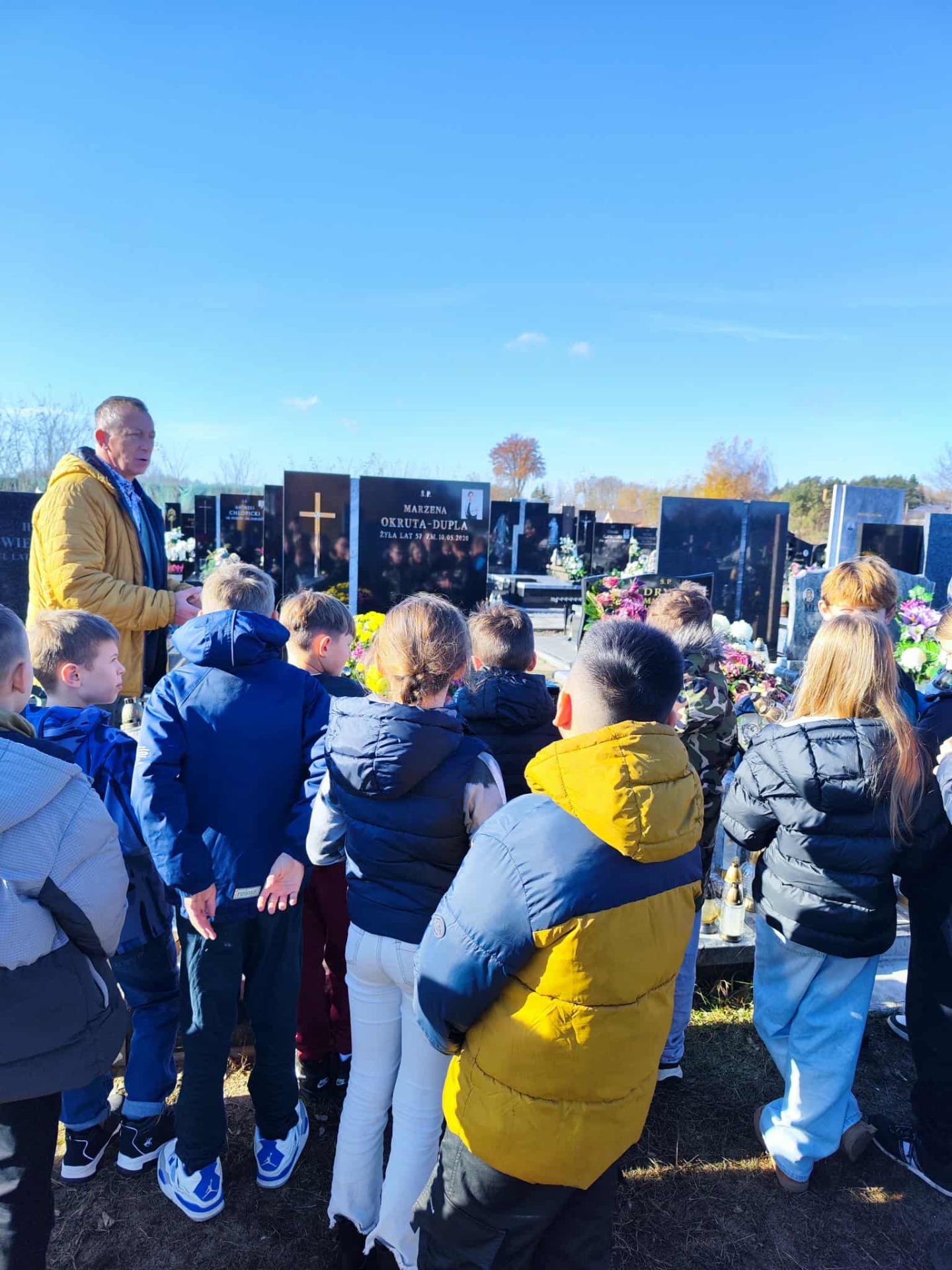 W dniu 4 listopada 2025 roku uczniowie klasy 4b wraz ze swoją wychowawczynią panią Karoliną Wąsik oraz panem Pawłem Stępnikowskim udali się na cmentarz parafialny we Wsoli, aby uczcić pamięć tych, którzy odeszli, i zapalić znicze na grobach zmarłych nauczycieli, pracowników szkoły oraz swoich najbliższych.