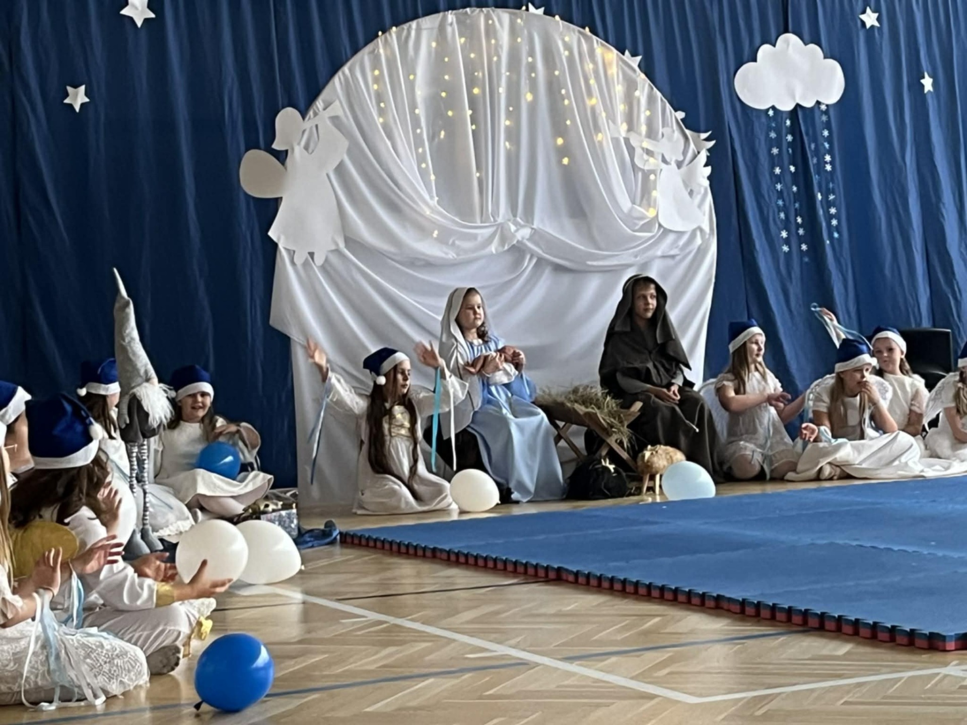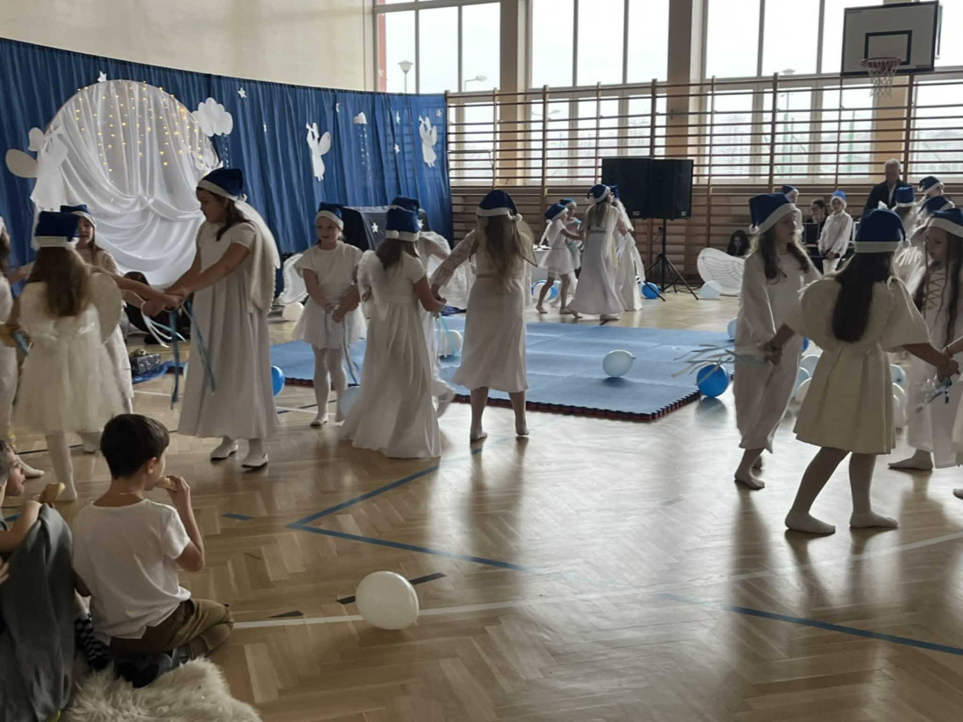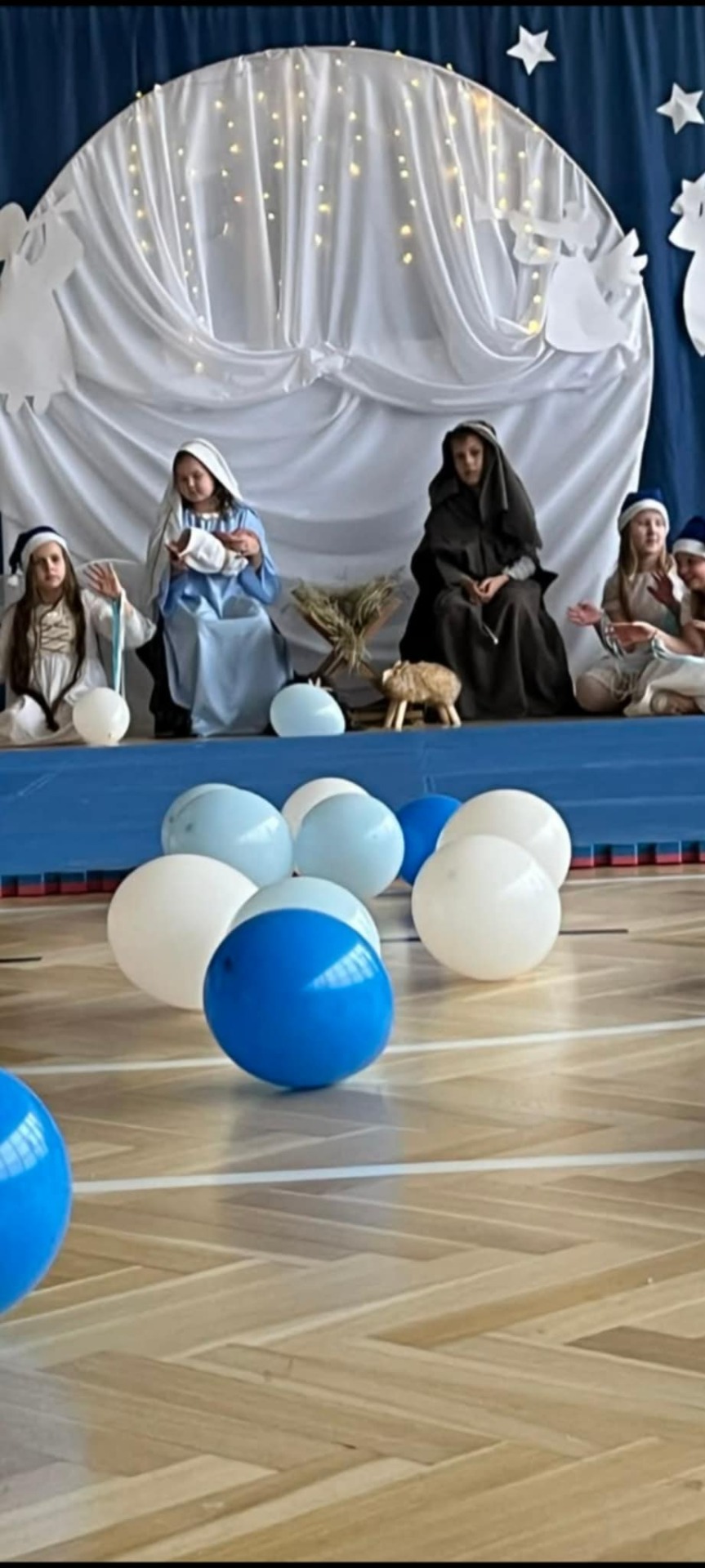 W czwartek 18 grudnia 2025 r. odbyły się szkolne jasełka z udziałem ponad sześćdziesięciorga dzieci z klas 1-6 i dziewczynki z grupy przedszkolnej IV i V. Na początku pani katechetka Magdalena Pońska - organizatorka widowiska - powitała całą społeczność szkolną i zaprosiła do uważnego oglądania. Na scenie zaroiło się od większych i całkiem maleńkich aniołków ubranych w przepiękne białe stroje z tiulu, błyszczące aureole i granatowe czapeczki. Aniołki tańczyły dla maleńkiego Jezusa, dekorowały niebo i niebiańskie choinki. Tę radosną atmosferę przerywały jednak scenki z naszej ludzkiej rzeczywistości: widok biednych, głodnych i samotnych dzieci, skłóconej rodziny, dla której najważniejsze były przedświąteczne zakupy i brata Alberta, który dzielił się zwykłym bochenkiem chleba z najuboższymi. To on właśnie przypomniał nam, że powinno się być zawsze takim jak chleb, który dla wszystkich leży na stole i którym każdy może się nakarmić, jeśli jest głodny. Następnie na scenie pojawili się najważniejsi bohaterowie tego świątecznego czasu: Maryja, Józef i Dzieciątko Jezus, po czym nasza szkolna solistka - Hania Starzyńska z klasy ósmej - przepięknie wykonała Pastorałkę prosto z nieba. Jezus otrzymał także prezent od dzieci, a był nim występ grupy akrobatek z klas 4-6 przygotowanych przez p. Edytę Kądrowską. Całość widowiska zwieńczyła puenta Archanioła, który powiedział: Jeśli myślicie, że to już koniec, to jesteście w błędzie. Ciąg dalszy przedstawienia ma się dokonać w Waszych sercach. Po spektaklu p. Dyrektor Dorota Dobosz złożyła wszystkim życzenia, a następnie rozdała opłatki, by każdy mógł, zgodnie z tradycją, połamać się dobrym słowem z innymi.