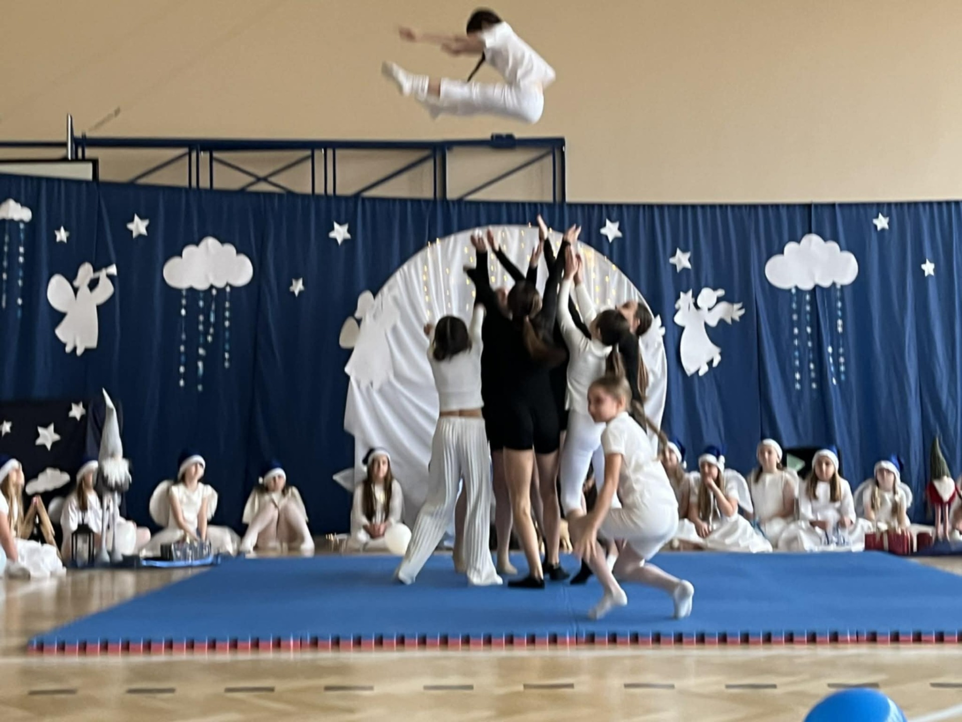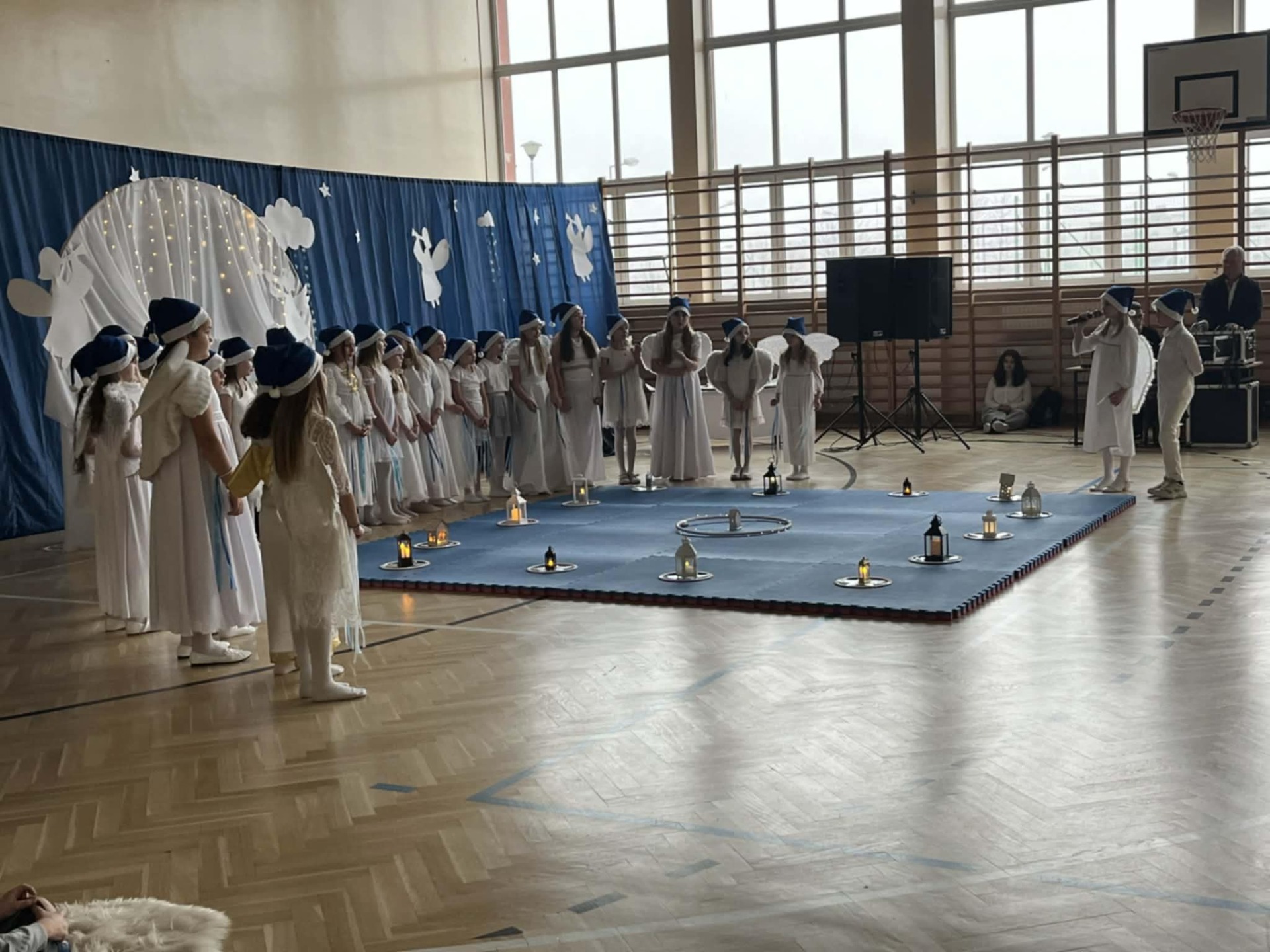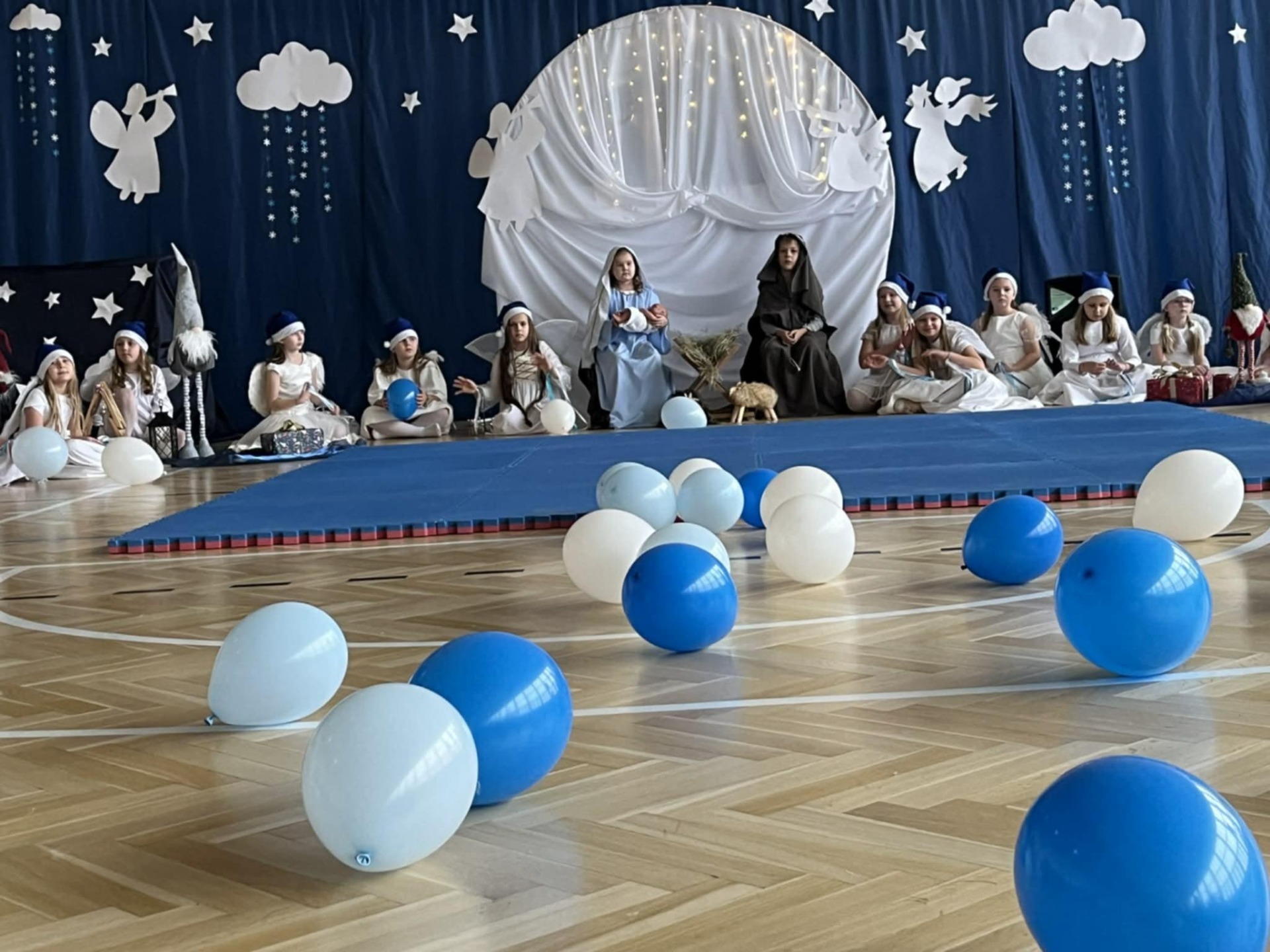 W czwartek 18 grudnia 2025 r. odbyły się szkolne jasełka z udziałem ponad sześćdziesięciorga dzieci z klas 1-6 i dziewczynki z grupy przedszkolnej IV i V. Na początku pani katechetka Magdalena Pońska - organizatorka widowiska - powitała całą społeczność szkolną i zaprosiła do uważnego oglądania. Na scenie zaroiło się od większych i całkiem maleńkich aniołków ubranych w przepiękne białe stroje z tiulu, błyszczące aureole i granatowe czapeczki. Aniołki tańczyły dla maleńkiego Jezusa, dekorowały niebo i niebiańskie choinki. Tę radosną atmosferę przerywały jednak scenki z naszej ludzkiej rzeczywistości: widok biednych, głodnych i samotnych dzieci, skłóconej rodziny, dla której najważniejsze były przedświąteczne zakupy i brata Alberta, który dzielił się zwykłym bochenkiem chleba z najuboższymi. To on właśnie przypomniał nam, że powinno się być zawsze takim jak chleb, który dla wszystkich leży na stole i którym każdy może się nakarmić, jeśli jest głodny. Następnie na scenie pojawili się najważniejsi bohaterowie tego świątecznego czasu: Maryja, Józef i Dzieciątko Jezus, po czym nasza szkolna solistka - Hania Starzyńska z klasy ósmej - przepięknie wykonała Pastorałkę prosto z nieba. Jezus otrzymał także prezent od dzieci, a był nim występ grupy akrobatek z klas 4-6 przygotowanych przez p. Edytę Kądrowską. Całość widowiska zwieńczyła puenta Archanioła, który powiedział: Jeśli myślicie, że to już koniec, to jesteście w błędzie. Ciąg dalszy przedstawienia ma się dokonać w Waszych sercach. Po spektaklu p. Dyrektor Dorota Dobosz złożyła wszystkim życzenia, a następnie rozdała opłatki, by każdy mógł, zgodnie z tradycją, połamać się dobrym słowem z innymi.
